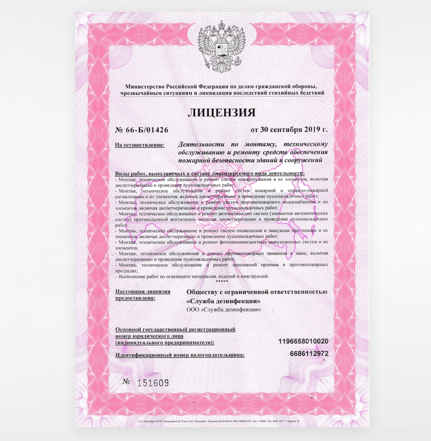 Лицензия позволяет компании оказывать услуги дезинфекции по всей России.